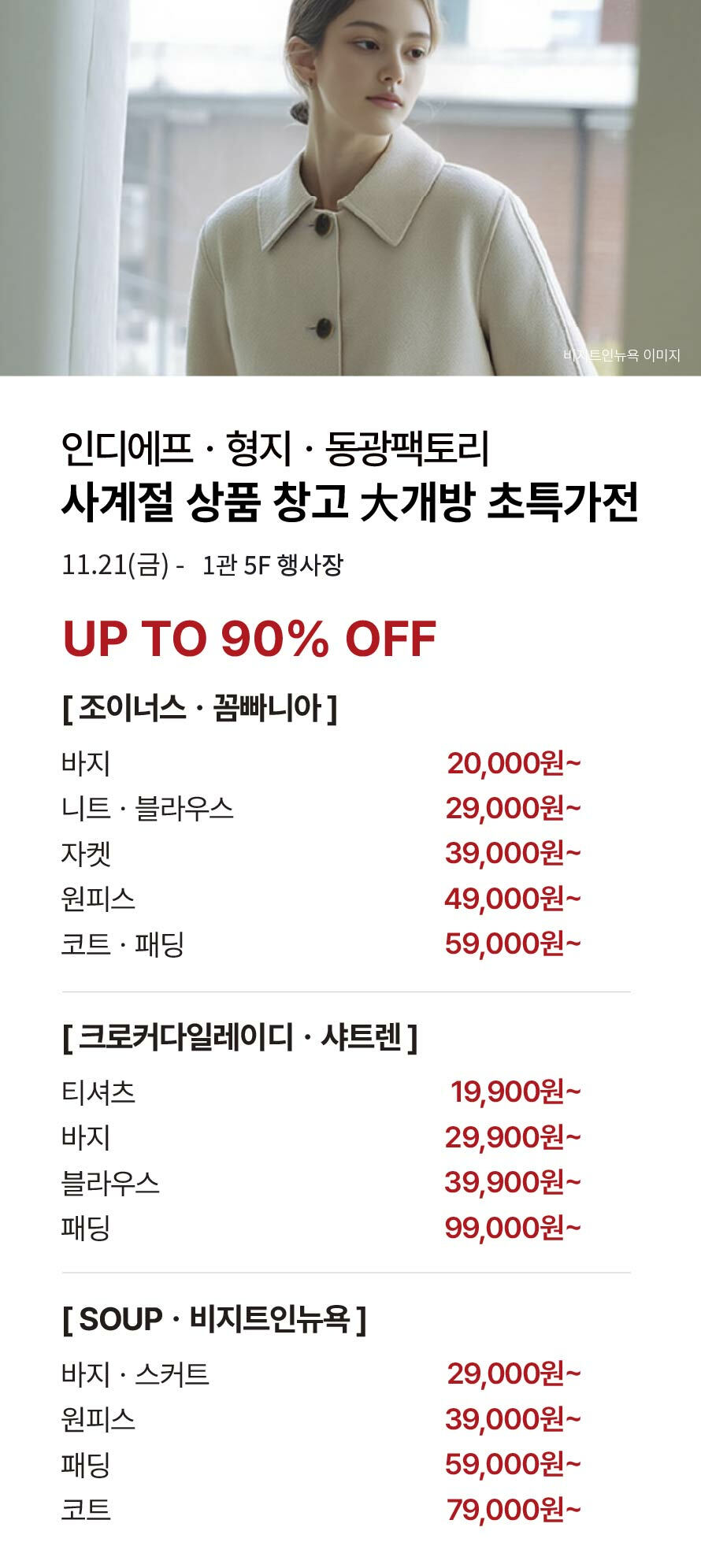 [인디에프·형지·동광 팩토리] 사계절 상품 창고大개방 초특가전 기간 : 2025-11-20 ~ 2025-11-27 위치 : 1관 5F 행사장 ▲ 대중교통 생활화 캠페인 다음글이 없습니다.