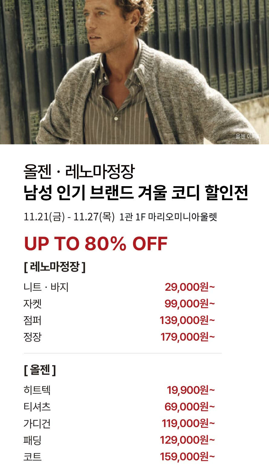 [올젠·레노마정장] 남성 인기브랜드 겨울코디 할인전 기간 : 2025-11-20 ~ 2025-11-27 위치 : 1관 1F 마리오미니아울렛 ▲ 대중교통 생활화 캠페인 다음글이 없습니다.