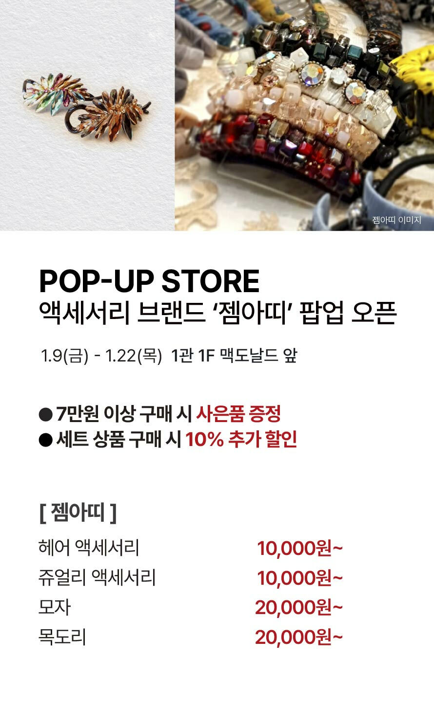 [POP UP] 악세서리 브랜드 '젬아띠' 팝업 스토어 오픈 기간 : 2026-01-09 ~ 2026-01-22 위치 : 1관 1F 맥도날드 앞 ▲ 대중교통 생활화 캠페인 다음글이 없습니다.