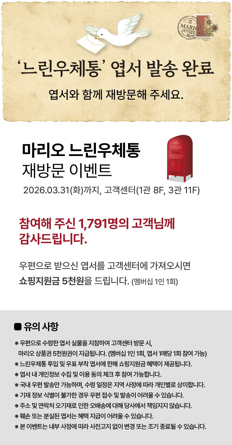 [느린우체통] 엽서 발송 완료! 기간 : ~ 2026-03-31 까지 위치 : 고객센터 (1관 8F, 3관 11F) ▲ 마리오게임빌리지연천 펜션 숙박권 이벤트 ▼ 3월 마리오게임빌리지연천 펜션 숙박권 당첨자