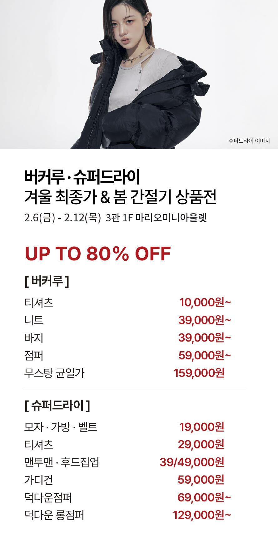 [버커루·슈퍼드라이] 겨울 최종가 & 봄 간절기 상품전 기간 : 2026-02-05 ~ 2026-02-12 위치 : 3관 1F 마리오미니아울렛 ▲ 3월 마리오게임빌리지연천 펜션 숙박권 당첨자 ▼ 대중교통 생활화 캠페인