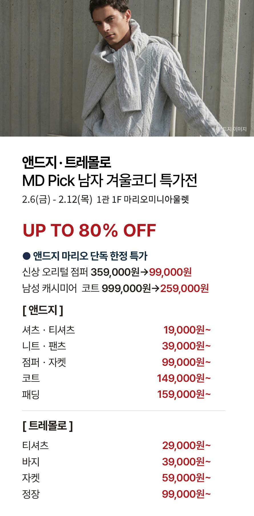 [앤드지·트레몰로] MD Pick 남자 겨울코디 특가전 기간 : 2026-02-05 ~ 2026-02-12 위치 : 1관 1F 마리오미니아울렛 ▲ 3월 마리오게임빌리지연천 펜션 숙박권 당첨자 ▼ 대중교통 생활화 캠페인