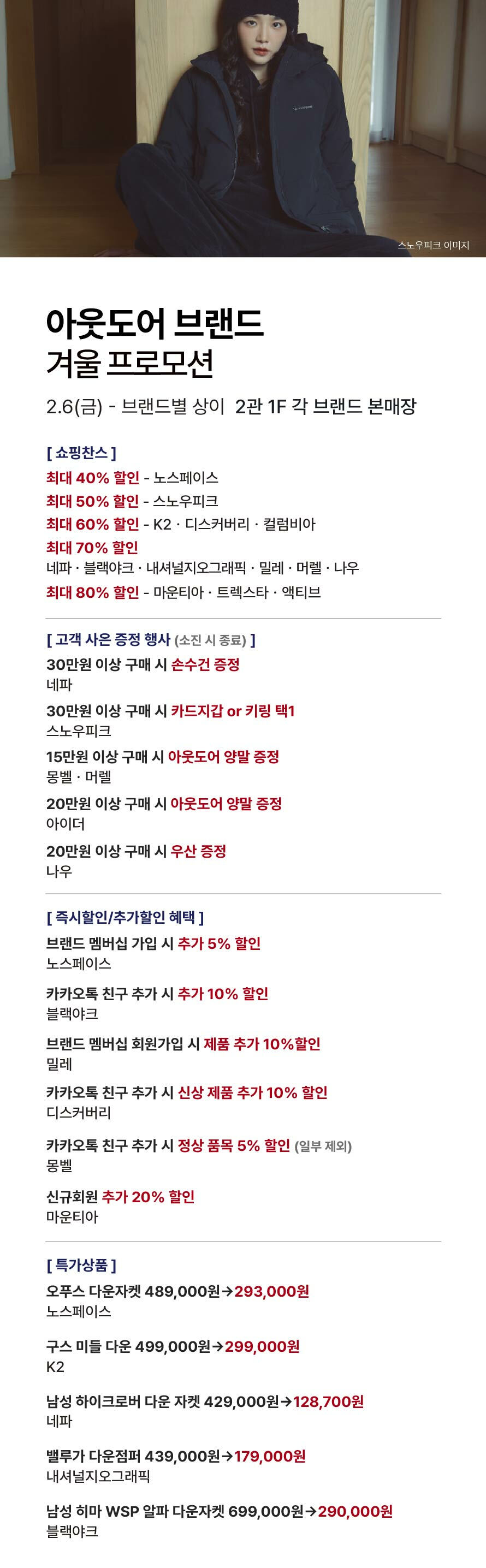 [아웃도어 브랜드] 겨울 프로모션 기간 : 2026-02-05 ~ 2026-02-12 위치 : 2관 1F 각 본매장 ▲ 3월 마리오게임빌리지연천 펜션 숙박권 당첨자 ▼ 대중교통 생활화 캠페인