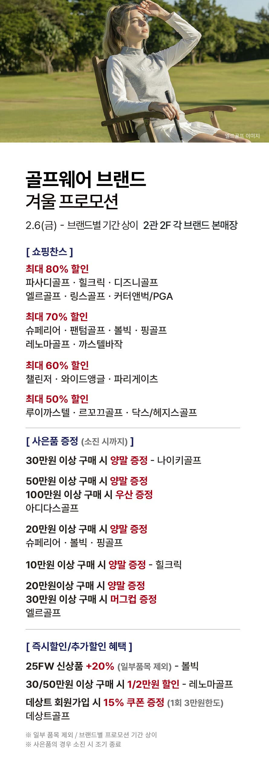 [골프웨어 브랜드] 겨울 프로모션 기간 : 2026-02-05 ~ 2026-02-12 위치 : 2관 2F 각 본매장 ▲ 3월 마리오게임빌리지연천 펜션 숙박권 당첨자 ▼ 대중교통 생활화 캠페인