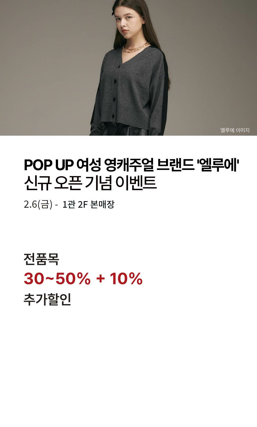 [POP UP] 여성 영캐주얼 브랜드 '엘루에' 신규 오픈 기념 이벤트 기간 : 2026-02-06 OPEN! 위치 : 1관 2F 본매장 ▲ 3월 마리오게임빌리지연천 펜션 숙박권 당첨자 ▼ 대중교통 생활화 캠페인