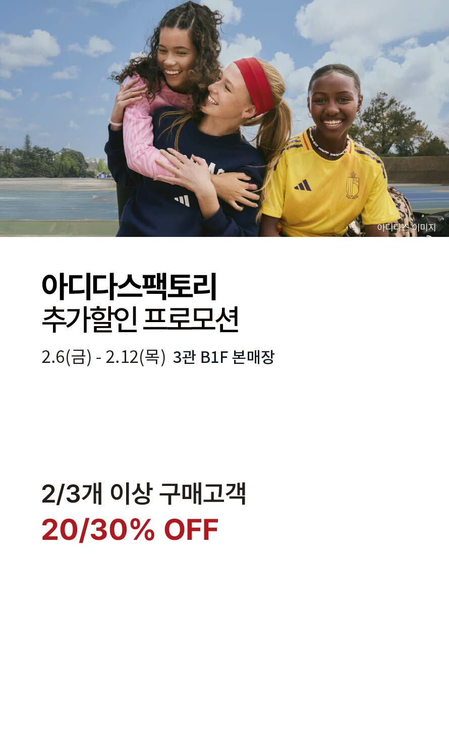 [아디다스 팩토리] 추가할인 프로모션 기간 : 2026-02-05 ~ 2026-02-09 위치 : 3관 B1F 본매장 ▲ 3월 마리오게임빌리지연천 펜션 숙박권 당첨자 ▼ 대중교통 생활화 캠페인