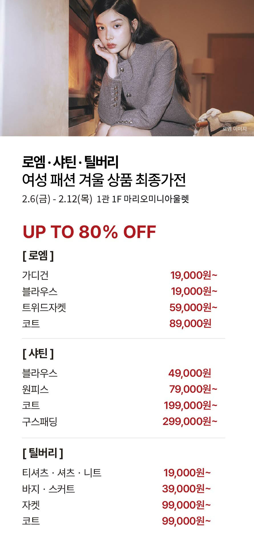 [로엠·샤틴·틸버리] 여성 패션 겨울 상품 최종가전 기간 : 2026-02-06 ~ 2026-02-12 위치 : 1관 1F 마리오미니아울렛 ▲ 3월 마리오게임빌리지연천 펜션 숙박권 당첨자 ▼ 대중교통 생활화 캠페인