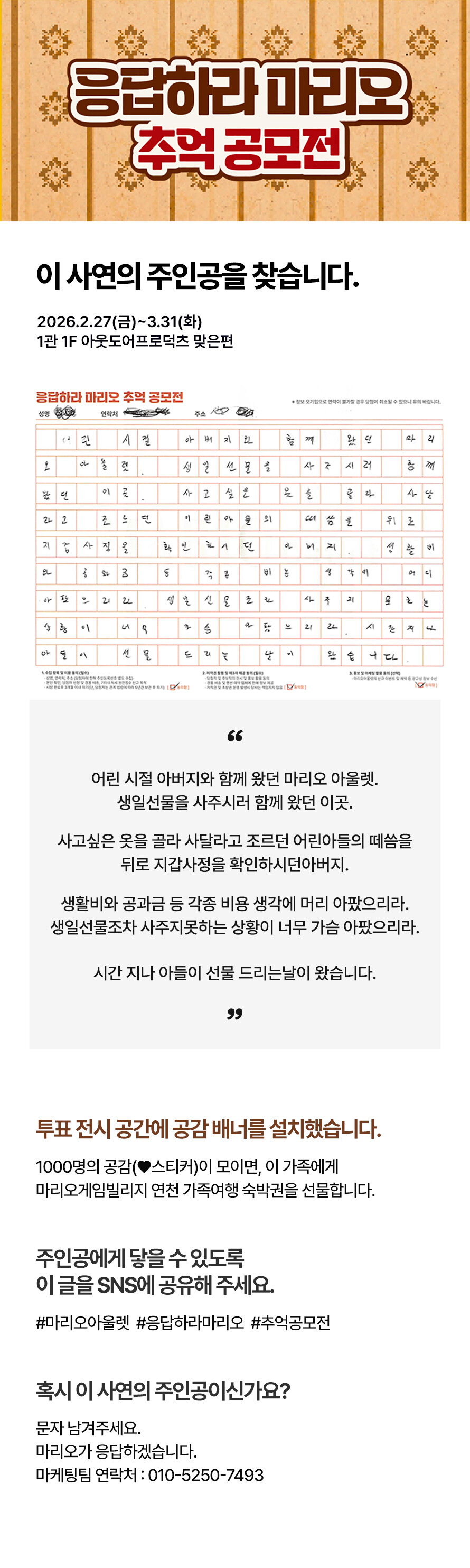 [응답하라 마리오 추억 공모전] 이 사연의 주인공을 찾습니다. 기간 : 2026-02-27 ~ 2026-03-31 위치 : 1관 1F 아웃도어프로덕츠 맞은편 ▲ 마리오게임빌리지연천 펜션 숙박권 이벤트 ▼ 3월 마리오게임빌리지연천 펜션 숙박권 당첨자