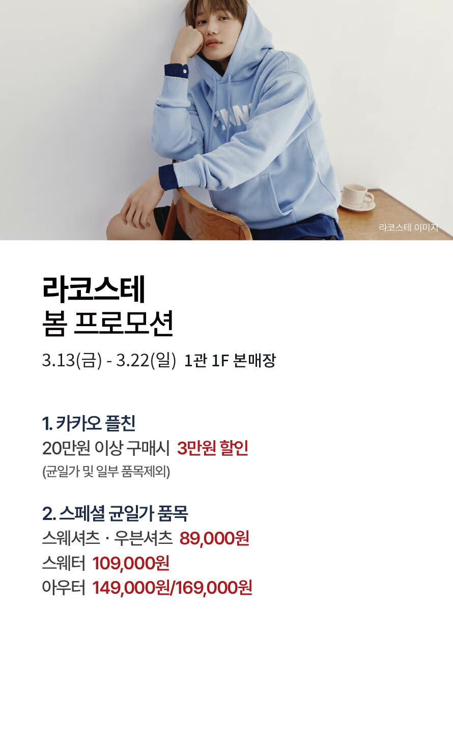 [라코스테] 봄 프로모션 기간 : 2026-03-19 ~ 2026-03-22 위치 : 1관 1F 본매장 ▲ 마리오게임빌리지연천 펜션 숙박권 이벤트 ▼ 3월 마리오게임빌리지연천 펜션 숙박권 당첨자