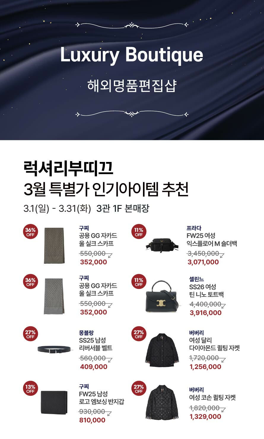 [럭셔리부띠끄] 3월 특별가 인기아이템 추천 기간 : 2026-03-19 ~ 2026-03-26 위치 : 3관 1F 본매장 ▲ 마리오게임빌리지연천 펜션 숙박권 이벤트 ▼ 3월 마리오게임빌리지연천 펜션 숙박권 당첨자