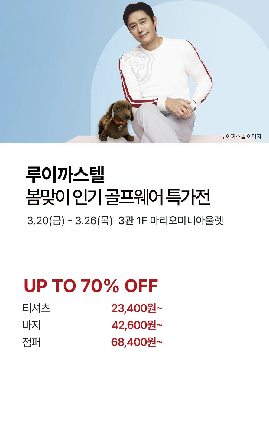 [루이까스텔] 봄맞이 인기 골프웨어 특가전 기간 : 2026-03-19 ~ 2026-03-26 위치 : 3관 1F 마리오미니아울렛 ▲ 마리오게임빌리지연천 펜션 숙박권 이벤트 ▼ 3월 마리오게임빌리지연천 펜션 숙박권 당첨자