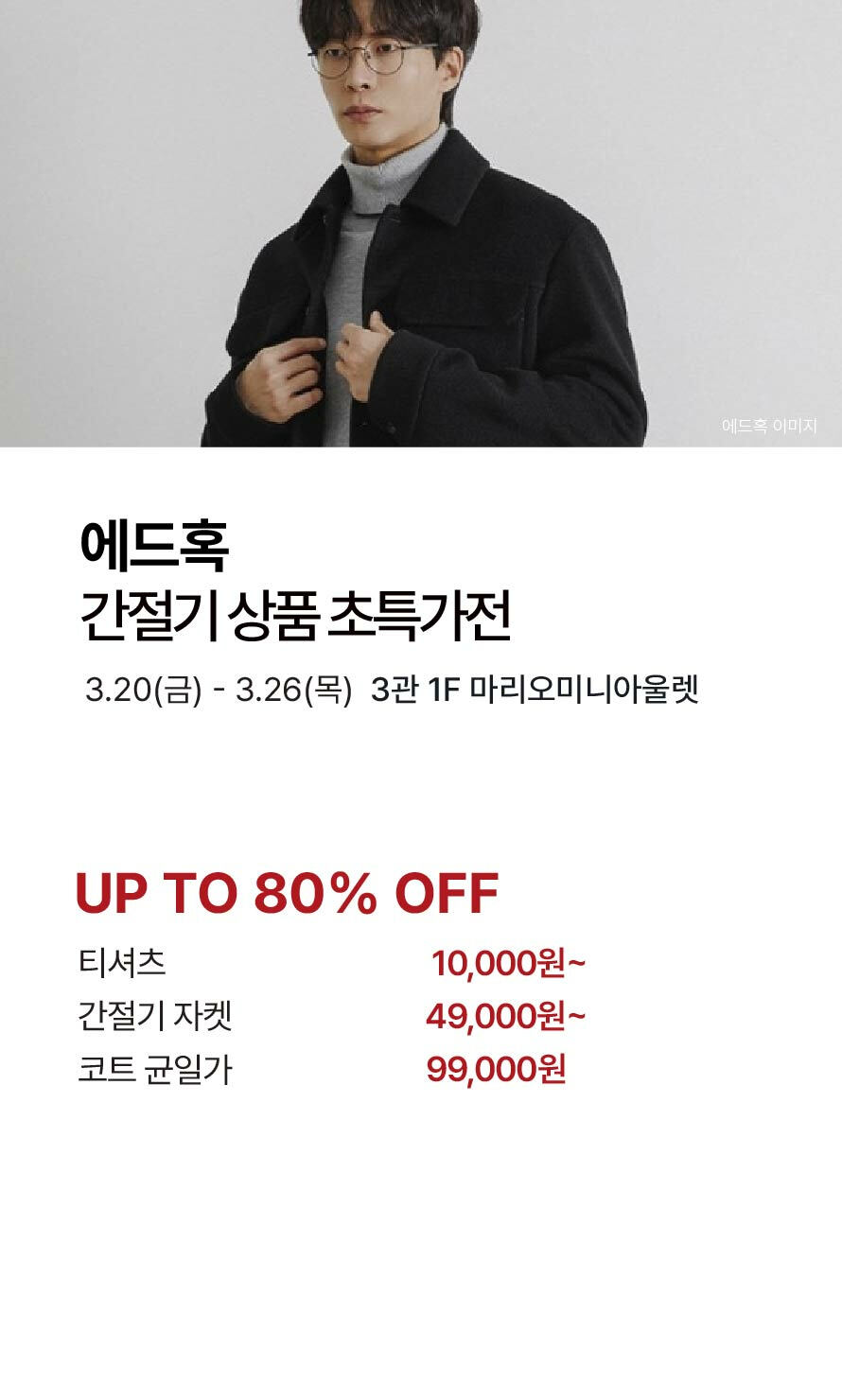 [에드혹] 간절기 상품 초특가전 기간 : 2026-03-19 ~ 2026-03-26 위치 : 3관 1F 마리오미니아울렛 ▲ 마리오게임빌리지연천 펜션 숙박권 이벤트 ▼ 3월 마리오게임빌리지연천 펜션 숙박권 당첨자