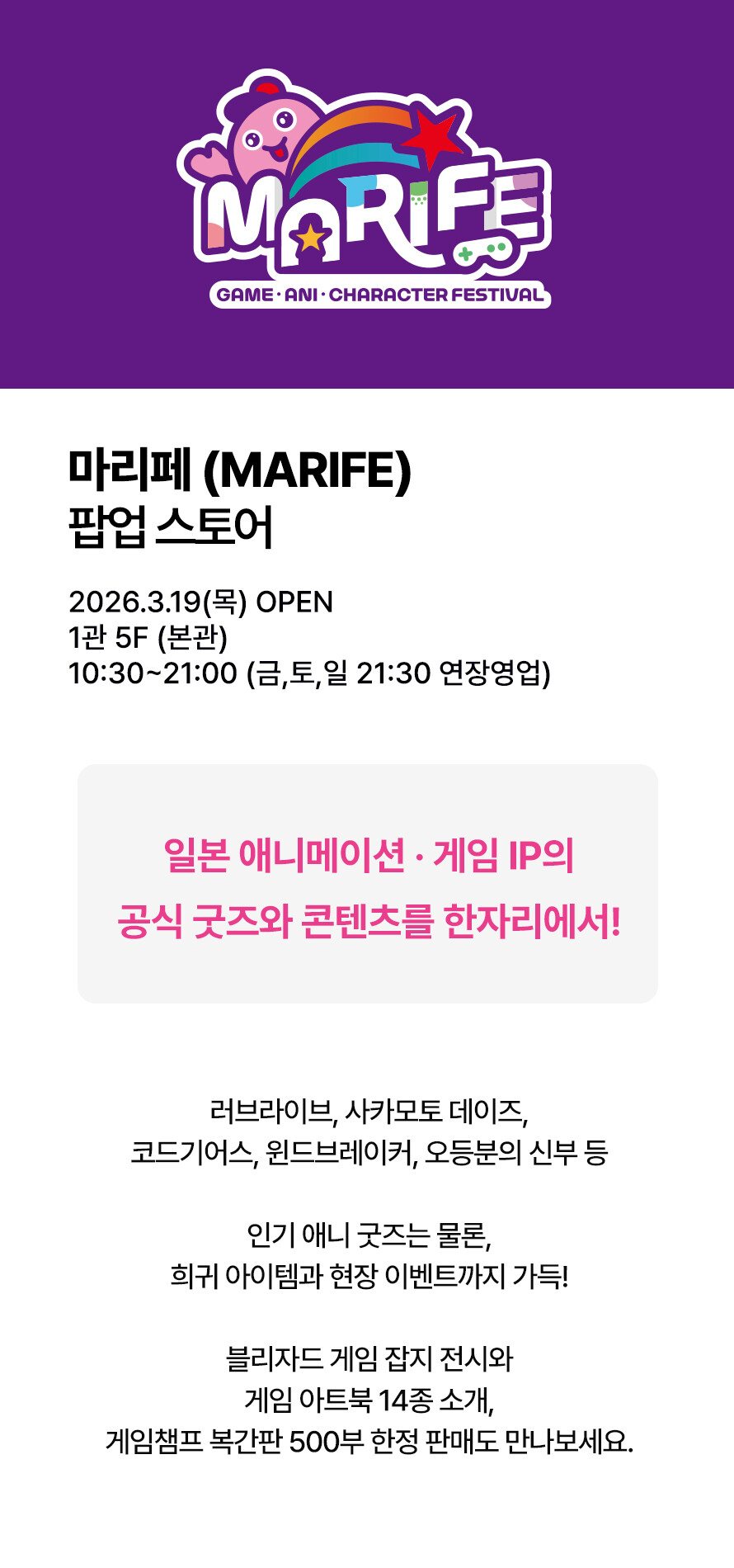 [팝업스토어] 애니·게임 IP 축제 마리페 OPEN 기간 : 2026-03-19 ~ 위치 : 1관 5F (본관) ▲ 3월 마리오게임빌리지연천 펜션 숙박권 당첨자 ▼ [어반드레스·비바셔스·젠더스트] 스트릿캐주얼 스페셜 팝업 오픈!
