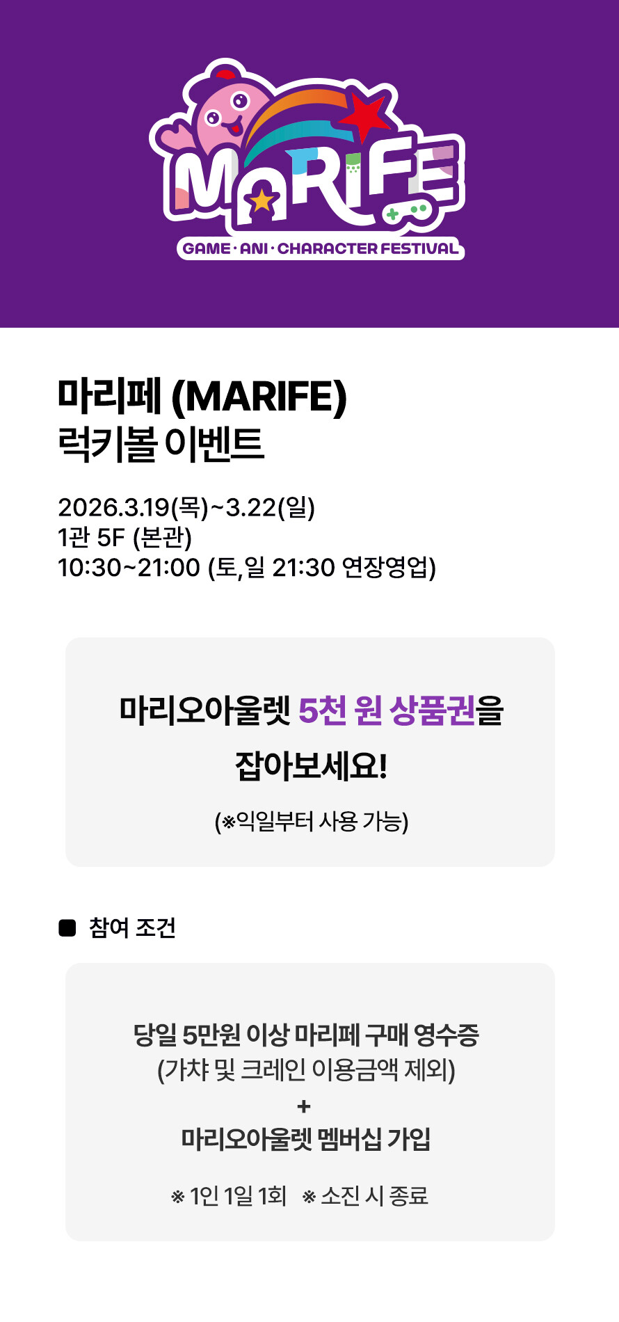 [이벤트] 마리페 팝업 스토어 럭키볼 이벤트 기간 : 2026-03-19 ~ 2026-03-22 위치 : 1관 5F (본관) 마리페 행사장 ▲ 마리오게임빌리지연천 펜션 숙박권 이벤트 ▼ 3월 마리오게임빌리지연천 펜션 숙박권 당첨자