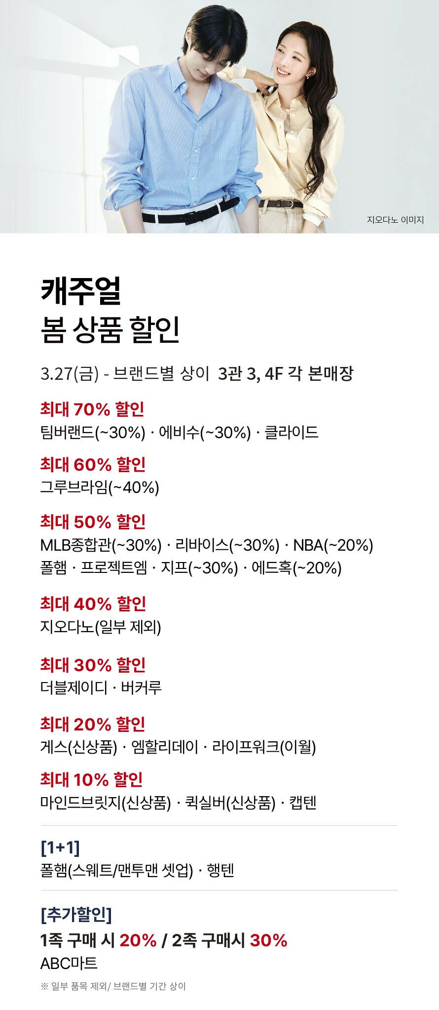 [캐주얼] 봄 상품 할인 기간 : 2026-03-27 ~ 각 브랜드 별 기간 상이 위치 : 3관 3·4F 각 본매장 ▲ [아디다스 팩토리] 추가세일 프로모션 ▼ [유·아동] 봄 상품 할인
