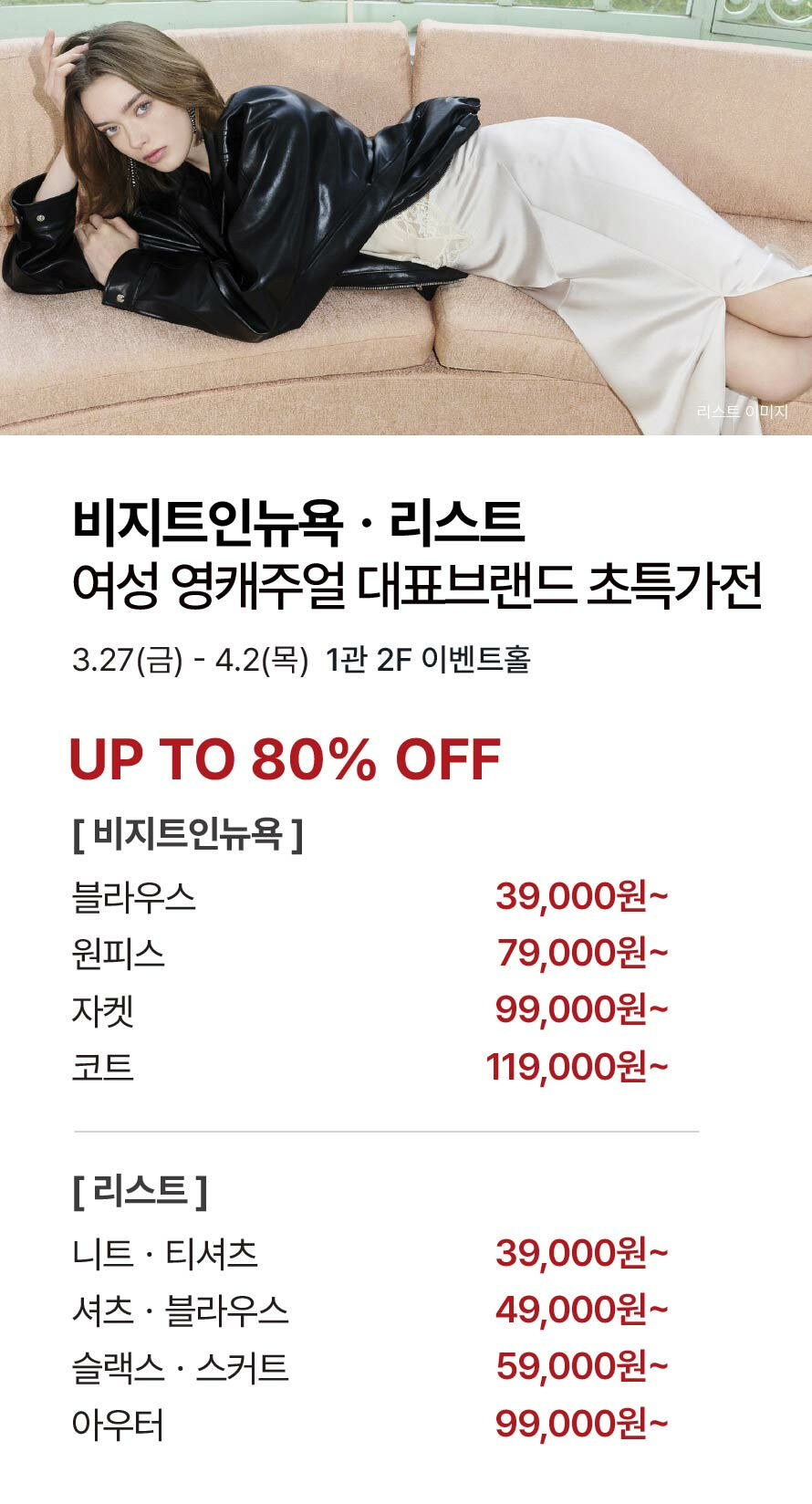 [비지트인뉴욕·리스트] 여성 영캐주얼 대표브랜드 초특가전 기간 : 2026-03-27 ~ 2026-04-02 위치 : 1관 2F 이벤트홀 ▲ [쉬즈미스·트리아나] 봄 인기상품 특가전 ▼ [헤지스] 봄 대표 의류 특가전