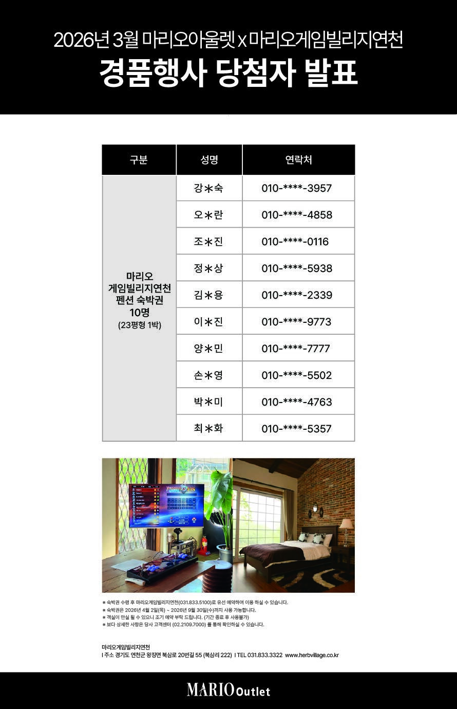 3월 마리오게임빌리지연천 펜션 숙박권 당첨자 기간 : 2026-04-01 ~ 2026-04-30 위치 : 1관 8F 고객센터 이전글이 없습니다. ▼ [팝업스토어] 애니·게임 IP 축제 마리페 OPEN