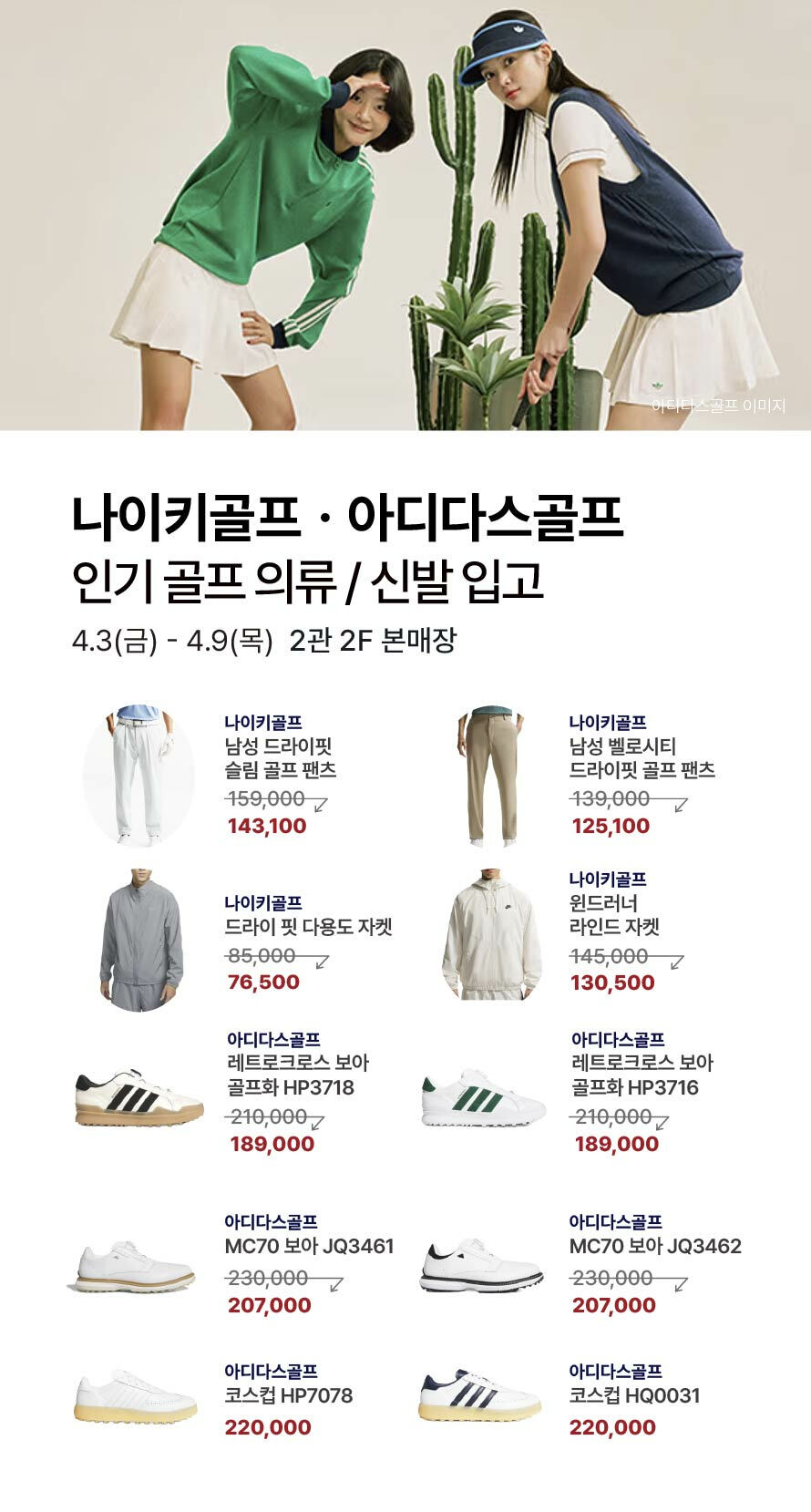 [나이키골프·아디다스골프] 인기 골프의류/신발 입고 기간 : 2026-04-03 ~ 2026-04-09 위치 : 2관 2F 본매장 ▲ [몽벨] 인기 잇(it) 아이템 ▼ [벤제프] 신규오픈 기념 골프웨어 최대 85%