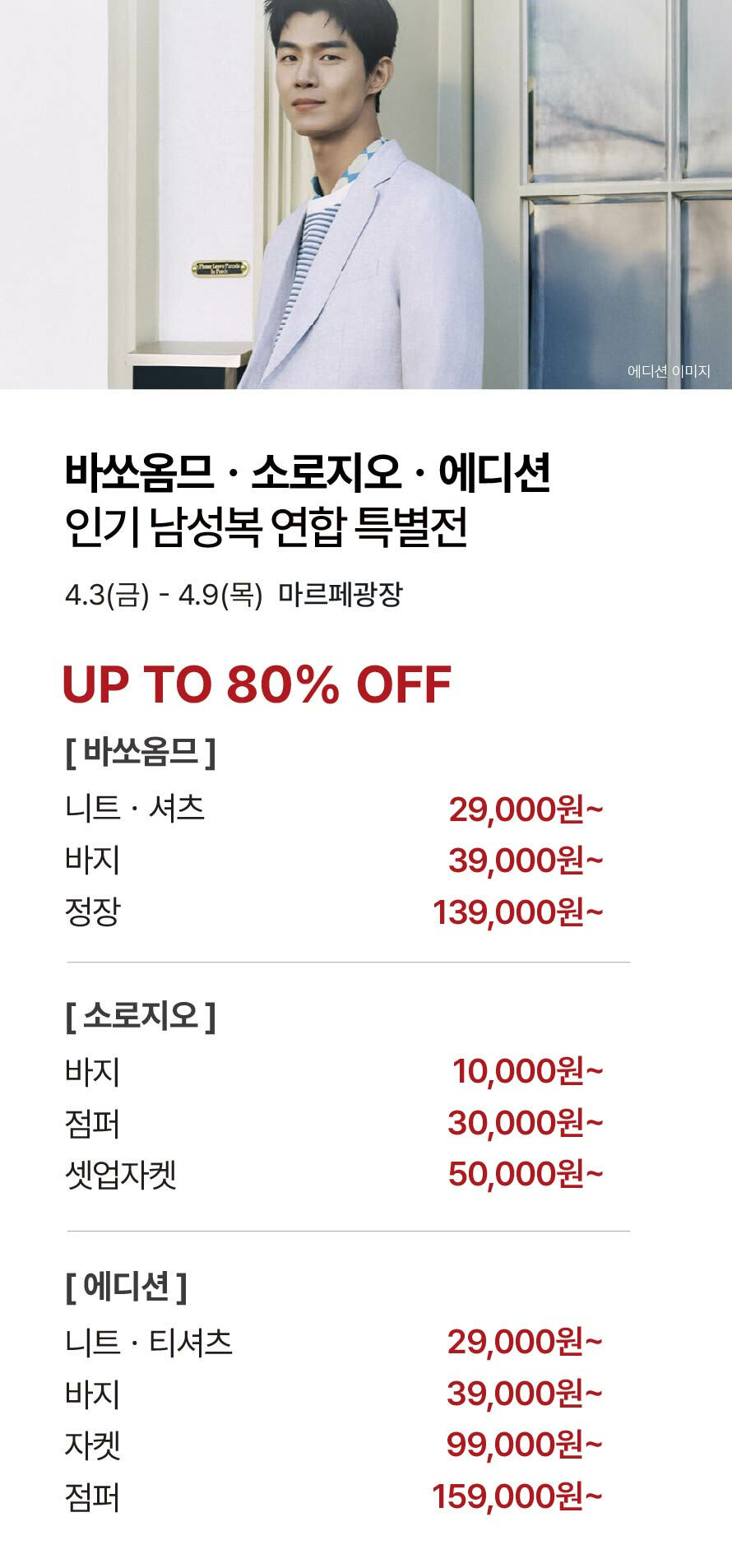 [바쏘옴므·소로지오·에디션] 인기 남성복 연합 특별전 기간 : 2026-04-03 ~ 2026-04-09 위치 : 마르페 광장 ▲ [인디안 팩토리] 봄맞이 의류 초특가전 ▼ [몽벨] 인기 잇(it) 아이템