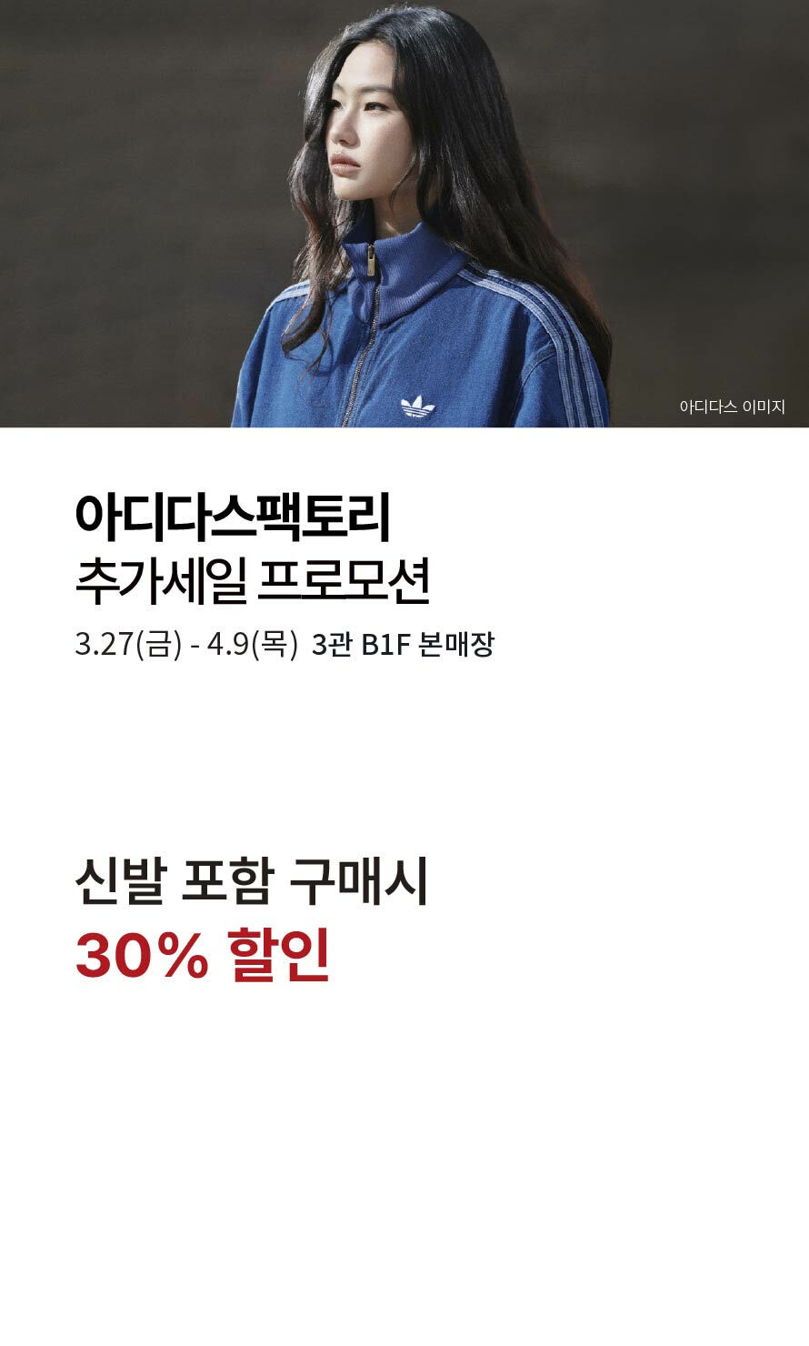 [아디다스 팩토리] 추가세일 프로모션 기간 : 2026-03-27 ~ 2026-04-09 위치 : 3관 B1F 본매장 ▲ [마하그리드·카비시·이스트쿤스트] 스트릿캐주얼 스페셜 팝업 오픈 ▼ [라코스테] 4월 할인 프로모션