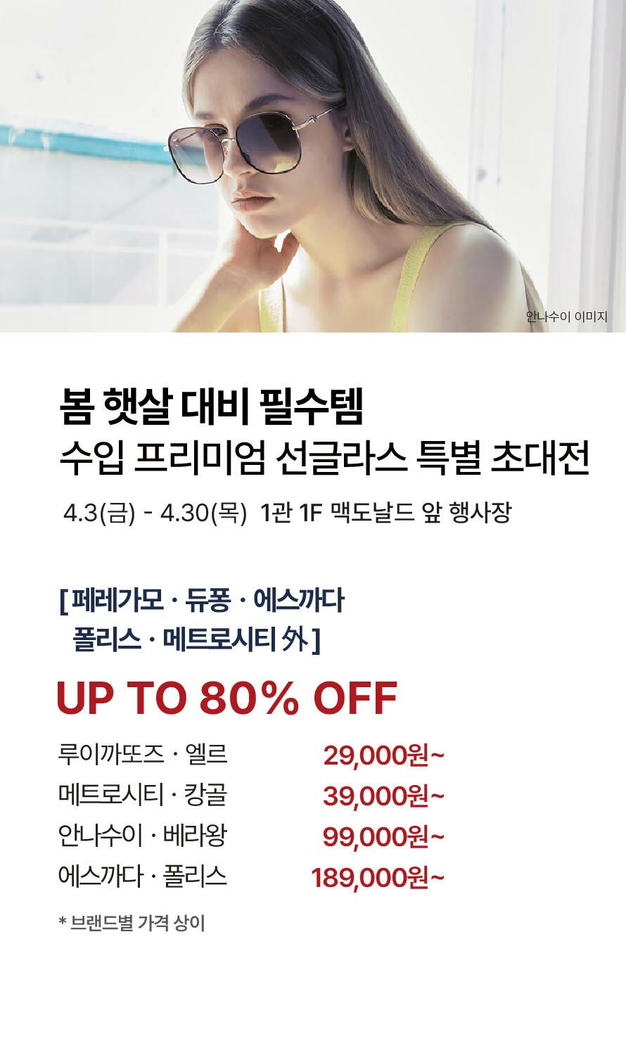 [봄 햇살 대비 필수템] 수입 프리미엄 선글라스 특별 초대전 기간 : 2026-04-03 ~ 2026-04-30 위치 : 1관 1F 맥도날드 앞 행사장 ▲ [라코스테] 4월 할인 프로모션 ▼ [로가디스] 마리오아울렛 단독 프로모션