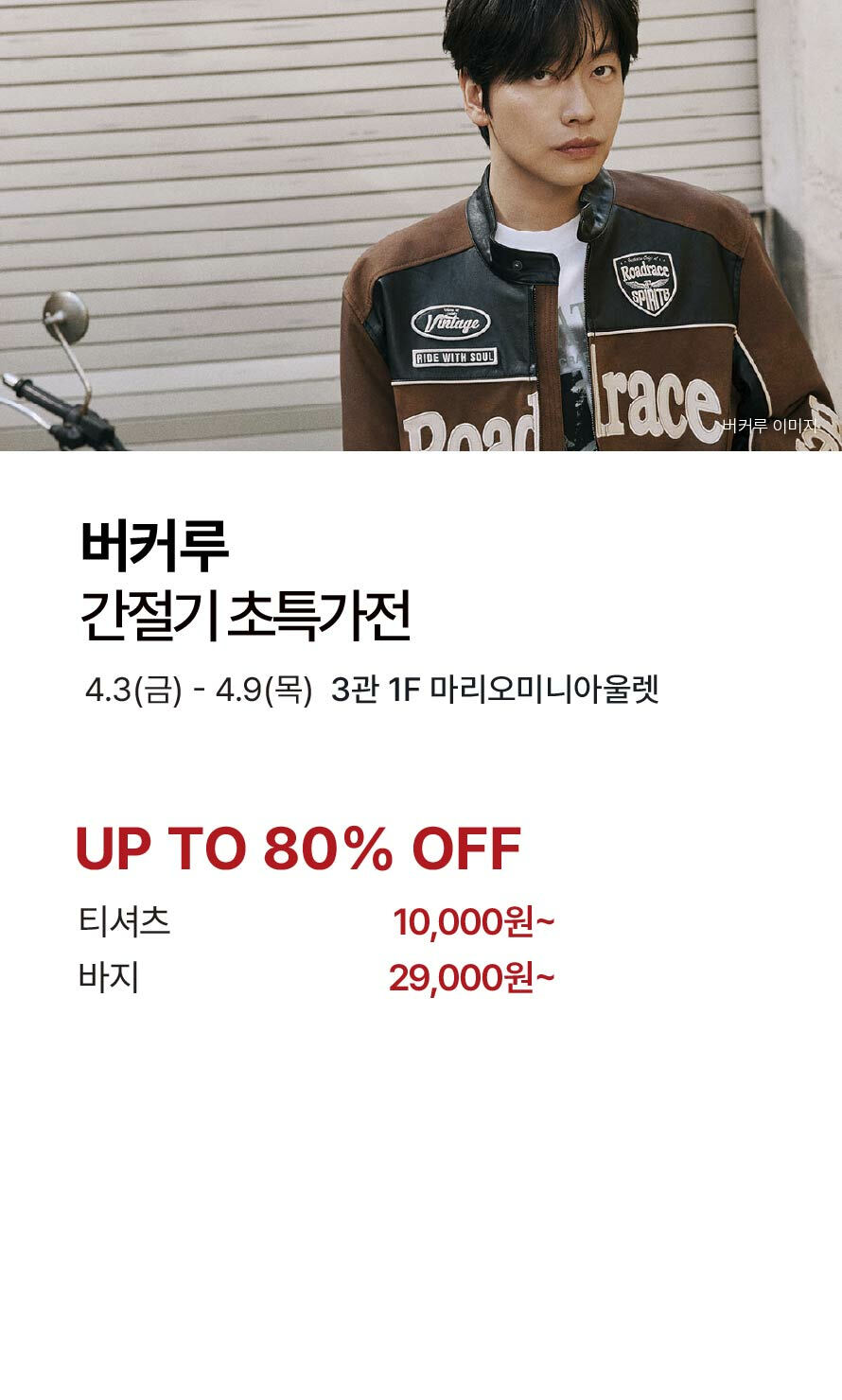 [버커루] 간절기 초특가전 기간 : 2026-04-03 ~ 2026-04-09 위치 : 3관 1F 마리오미니아울렛 ▲ [클라이드] S/S 균일가 상품 대방출! ▼ [캐주얼] S/S 시즌 초특가전